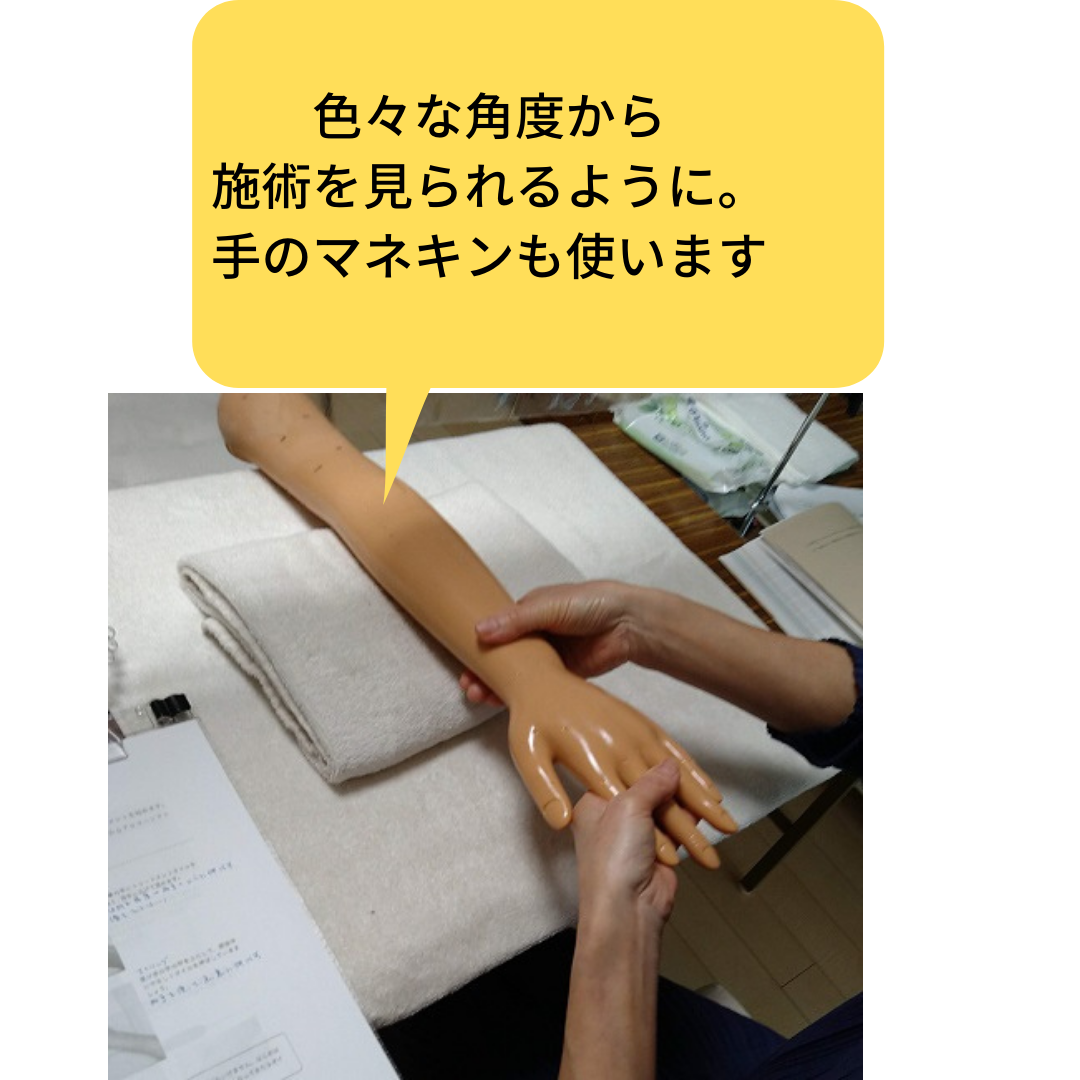 手のマネキンを使用し、色々な角度から施術を見て学んでいただきます。