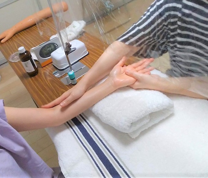 ・講師が練習台となり、力加減や手の動きなどアロマハンドトリートメントの技術を細やかにご指導いたします