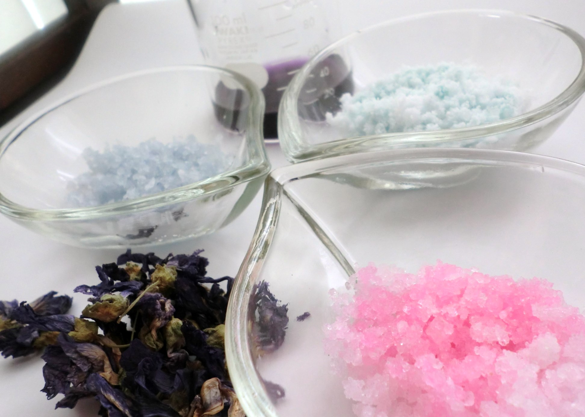 マジカルハーブと呼ばれるウスベニアオイを使って3種類のバスソルトを作ります。