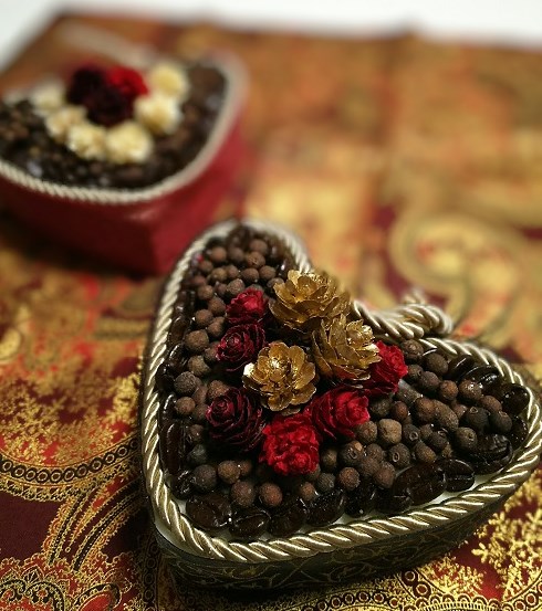 オールスパイスとコーヒー豆をハートの型に貼り付け、木の実を飾ります。お部屋に珈琲とオールスパイスの優雅な香りが広がります。