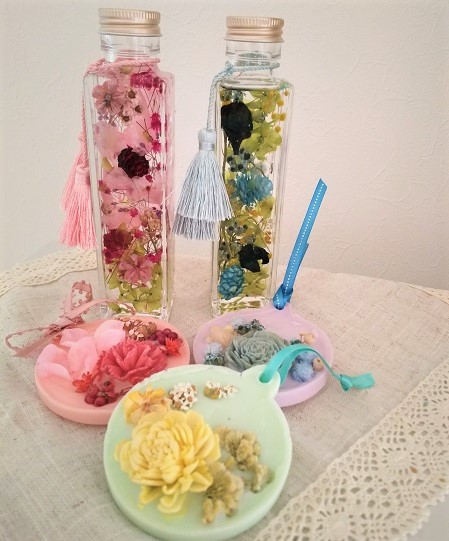 キラキラきらめくハーバリウムと優しい香りのアロマワックスバーを作ります。